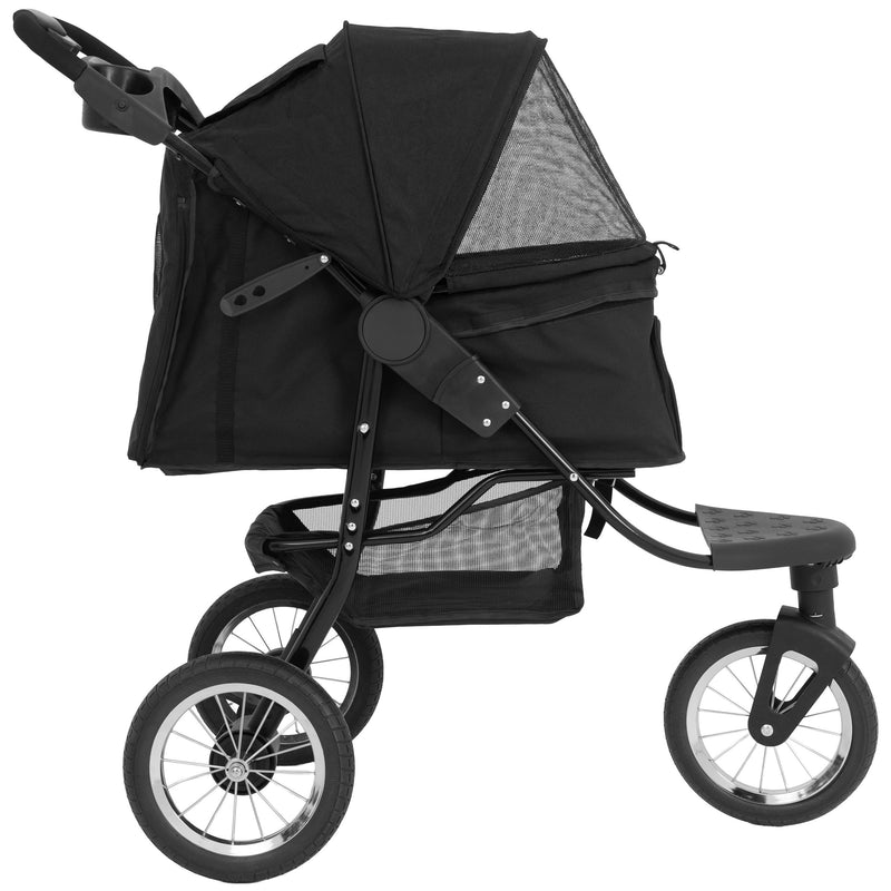 Fabricado con un chasis robusto y pensando en un manejo suave, el carrito cuenta con resistentes ruedas de 12 pulgadas sin cámara y a prueba de pinchazos, que ofrecen seguridad en todo tipo de terrenos. Su ágil diseño de 3 ruedas asegura una excelente maniobrabilidad, mientras que el freno de pie integrado permite detenerlo de forma segura en cualquier momento. Los prácticos accesos delantero y trasero facilitan que tu mascota entre y salga del carrito, reduciendo el esfuerzo tanto para ti como para tu compañero.