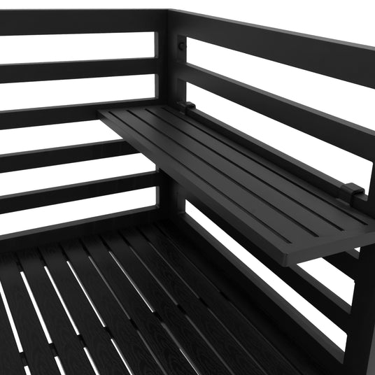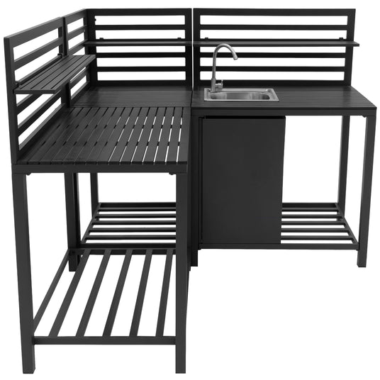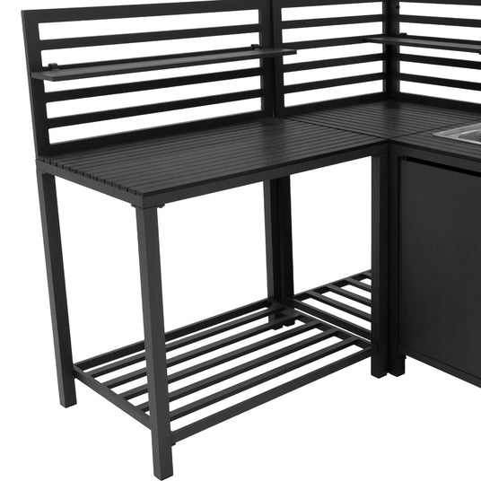 Fabricado en aluminio con recubrimiento en polvo y acabado gris antracita, este conjunto de tres piezas combina durabilidad excepcional con una estética moderna y atractiva. Incluye una unidad de fregadero con lavabo de acero inoxidable y grifo, una unidad de esquina y una amplia encimera de trabajo, lo que permite una instalación flexible en línea recta o en forma de esquina, según el espacio y tus preferencias.