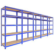 Este juego de 5 x estanterías azules/bahías de estanterías de almacén de la gama T-Rax es exclusivo de Monster Racking. Son 100 % sin tornillos, Monster resistentes y cada unidad de estantería mide 900 mm x 450 mm x 1800 mm (ancho x fondo x alto).