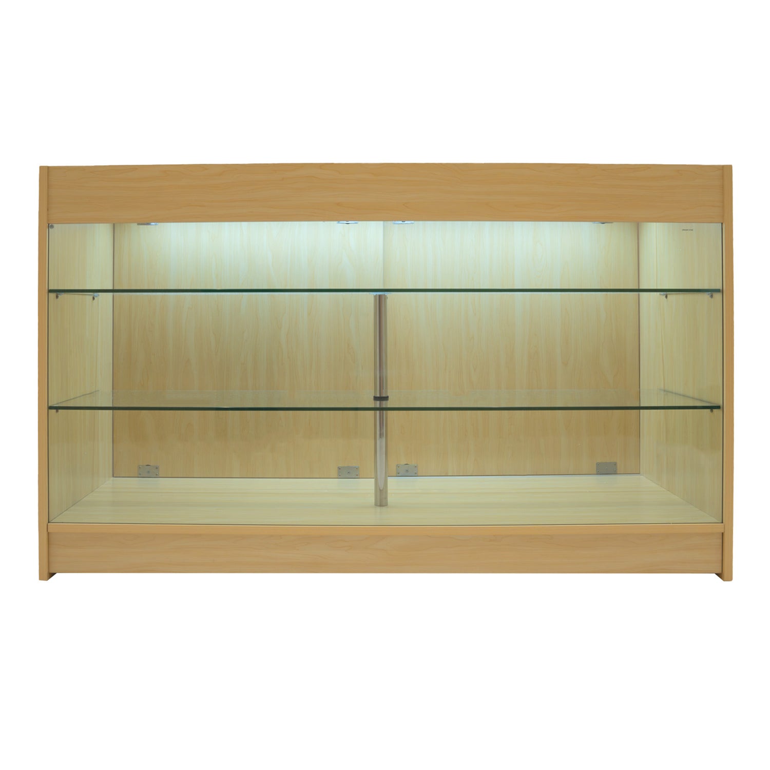 Todos los mostradores están fabricados con MDF de alta calidad y un acabado en melamina en color Arce resistente, garantizando durabilidad y una estética moderna y uniforme. Este acabado compartido crea una apariencia cohesiva en todo el conjunto, mientras que los elementos de vidrio templado de la K1500 aportan un toque sofisticado a las zonas de exposición clave.