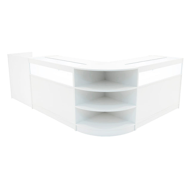 Todos los mostradores están fabricados en MDF de alta calidad con un acabado en melamina blanca duradera, lo que garantiza un rendimiento prolongado y una estética contemporánea uniforme. Este acabado compartido crea una apariencia cohesiva en toda la distribución, mientras que los elementos de vidrio templado del B1200 aportan un toque refinado a las áreas de exhibición principales.