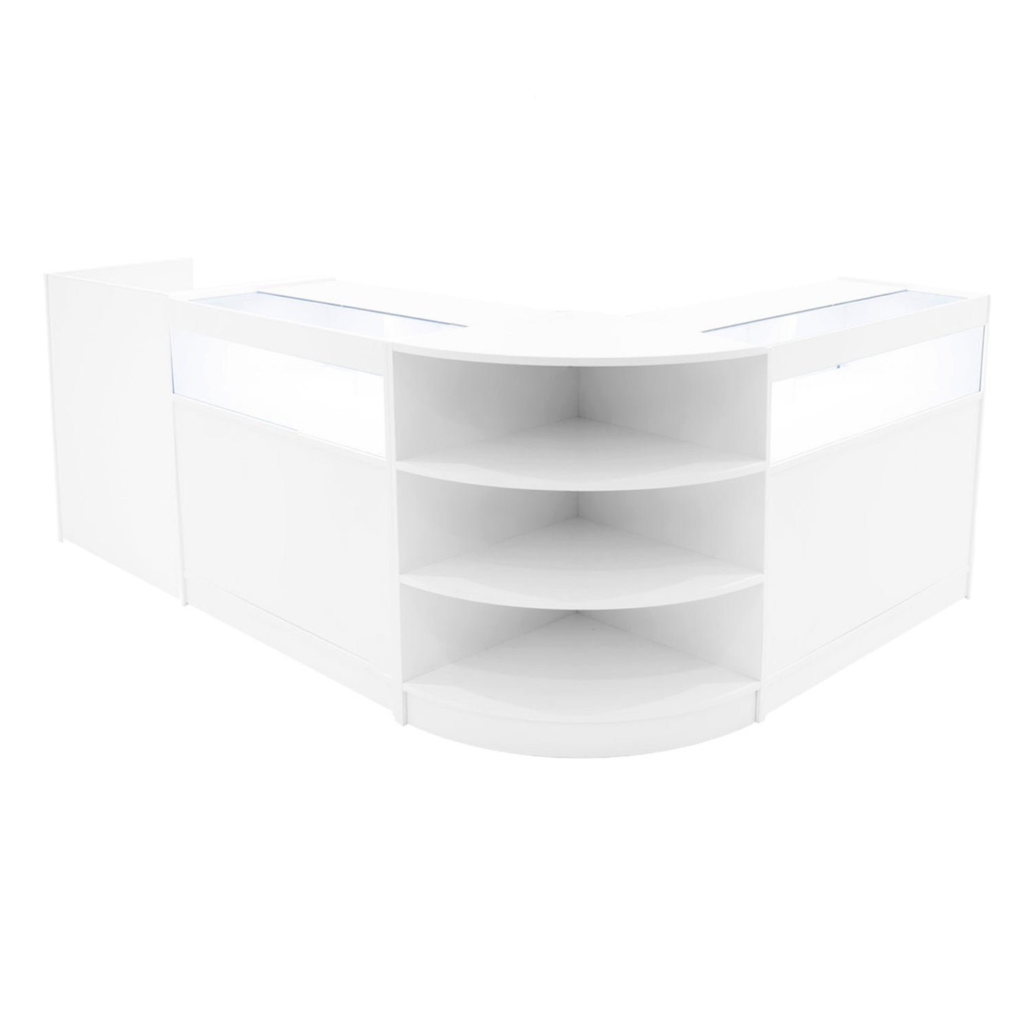 Todos los mostradores están fabricados en MDF de alta calidad con un acabado en melamina blanca duradera, lo que garantiza un rendimiento prolongado y una estética contemporánea uniforme. Este acabado compartido crea una apariencia cohesiva en toda la distribución, mientras que los elementos de vidrio templado del B900 aportan un toque refinado a las áreas de exhibición principales.