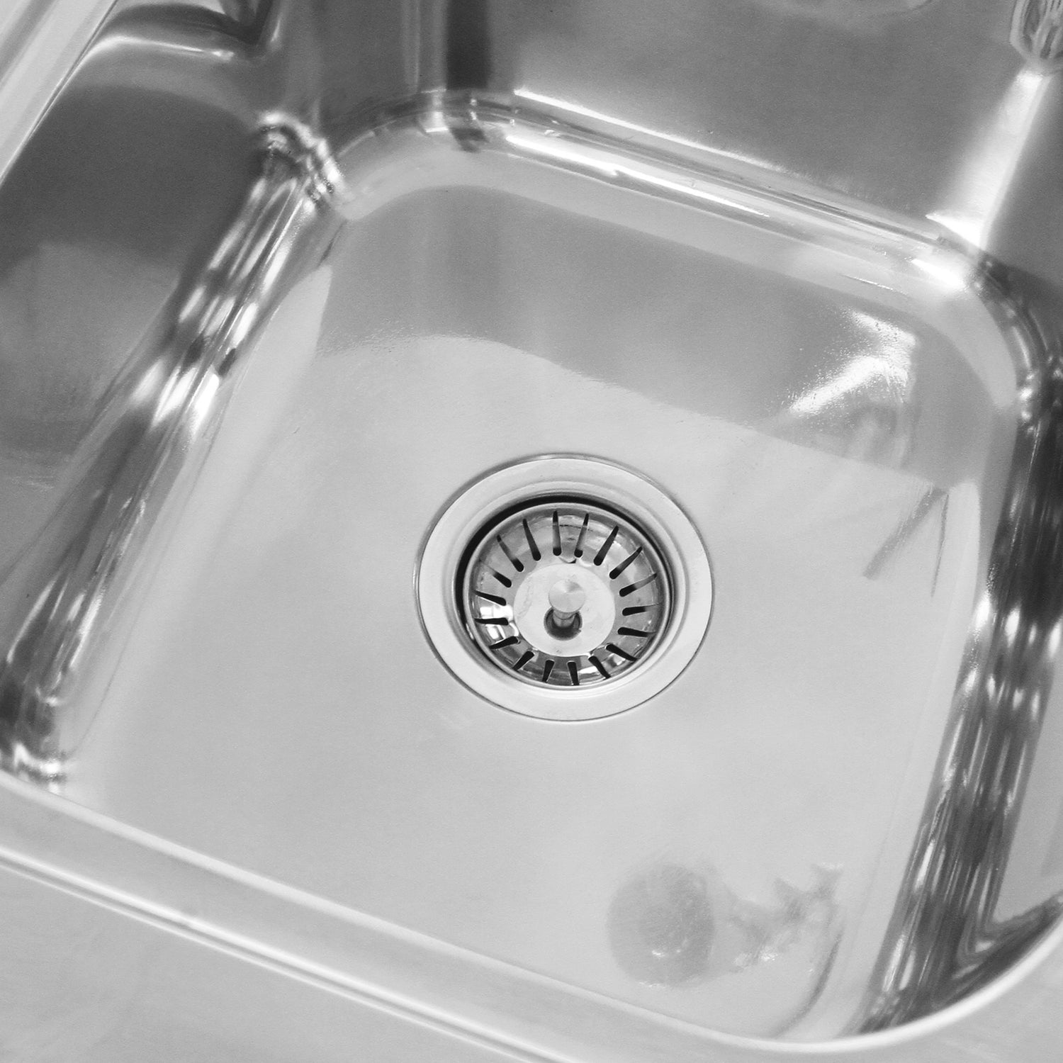 ¡Con estructura de acero inoxidable grado SS02, es fácil de mantener limpio y seguramente lucirá tan brillante y reluciente como tu cocina! El espacioso escurridor a la derecha te da mucho espacio para secar todo, desde cubiertos y platos hasta ollas y sartenes.