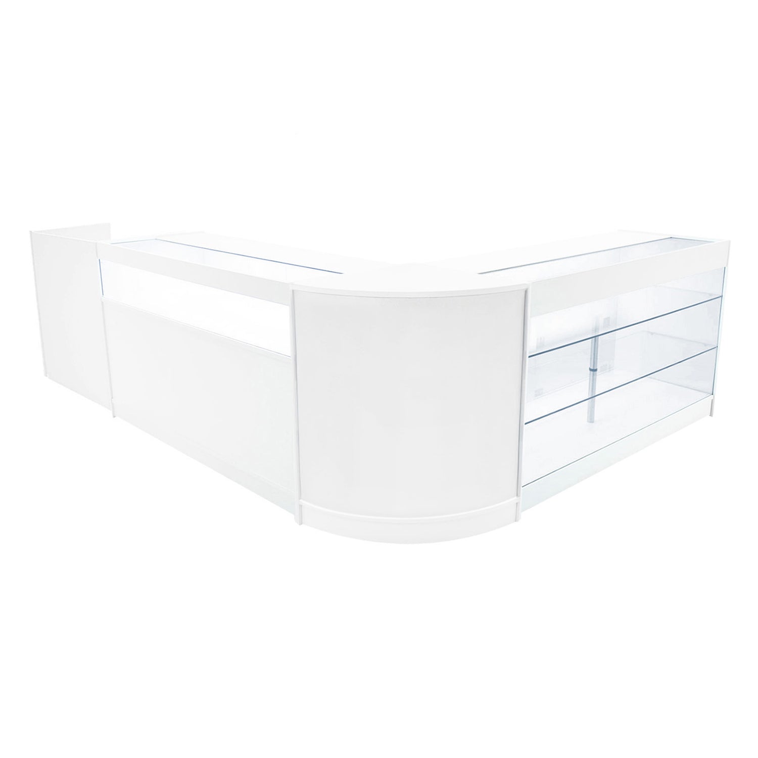 El mostrador de esquina CM60 introduce una flexibilidad modular en el diseño de su tienda. Su forma curvada se adapta perfectamente a las esquinas o se conecta sin interrupciones con mostradores rectos, creando transiciones suaves que unifican visual y físicamente varias unidades en una estructura coherente. Aunque compacto, cuenta con estanterías internas ocultas que ofrecen un espacio de almacenamiento práctico sin comprometer su aspecto elegante y minimalista. Esta unidad es especialmente eficaz para optimizar el espacio del suelo mientras mantiene una línea de diseño uniforme en todo el local.
