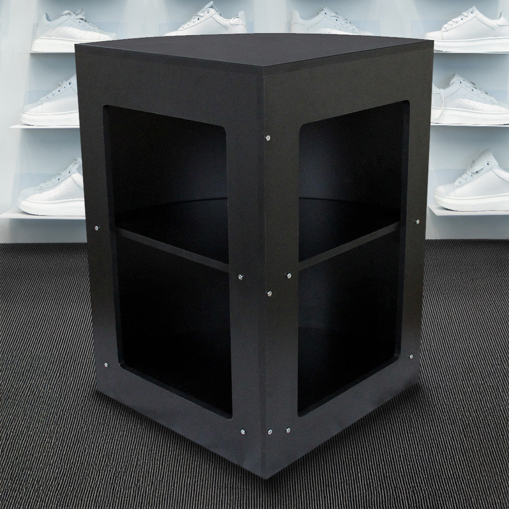 Fabricado en MDF resistente con un acabado laminado en melamina negra, combina durabilidad y un estilo contemporáneo, aportando carácter y elegancia a cualquier interior. Su base de 600 mm x 600 mm permite aprovechar las esquinas sin sobrecargar el espacio, mientras que su altura de 900 mm ofrece una superficie cómoda tanto para trabajar como para exponer productos.