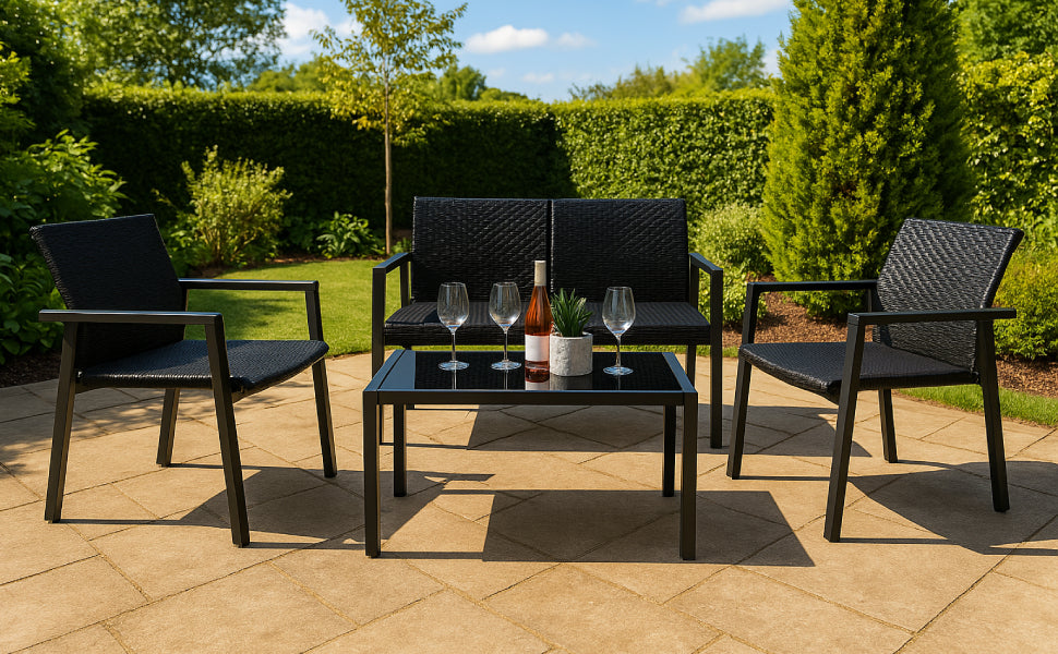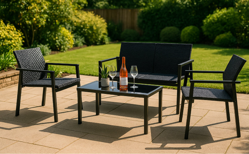 Con dos cómodas sillas, un sofá de dos plazas haciendo juego y una mesa de café con tapa de vidrio, este conjunto es la adición perfecta para cualquier jardín, patio o balcón. El elegante poliratán negro tejido a máquina, ofrece un aspecto moderno y atemporal, fusionándose perfectamente con cualquier decoración exterior mientras proporciona una estructura resistente a la intemperie. Ya sea para disfrutar de un café por la mañana o para recibir invitados, este conjunto garantiza comodidad y funcionalidad.