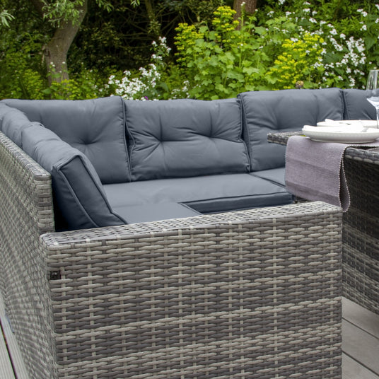 Con un acabado de ratán gris llamativo y compensado con cojines grises extra gruesas, el conjunto aporta un toque moderno y lujoso a su jardín. Con la adición de una capa protectora UV, puede estar seguro de que sus muebles estarán protegidos de los elementos durante todo el año, ayudando a mantener su hermoso color.