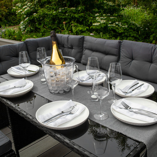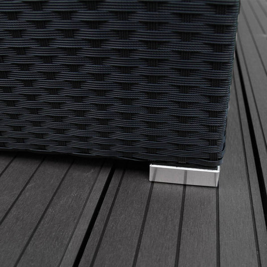 Con un acabado de ratán negro llamativo y compensado con cojines grises extra gruesas, el conjunto aporta un toque moderno y lujoso a su jardín. Con la adición de una capa protectora UV, puede estar seguro de que sus muebles estarán protegidos de los elementos durante todo el año, ayudando a mantener su hermoso color.