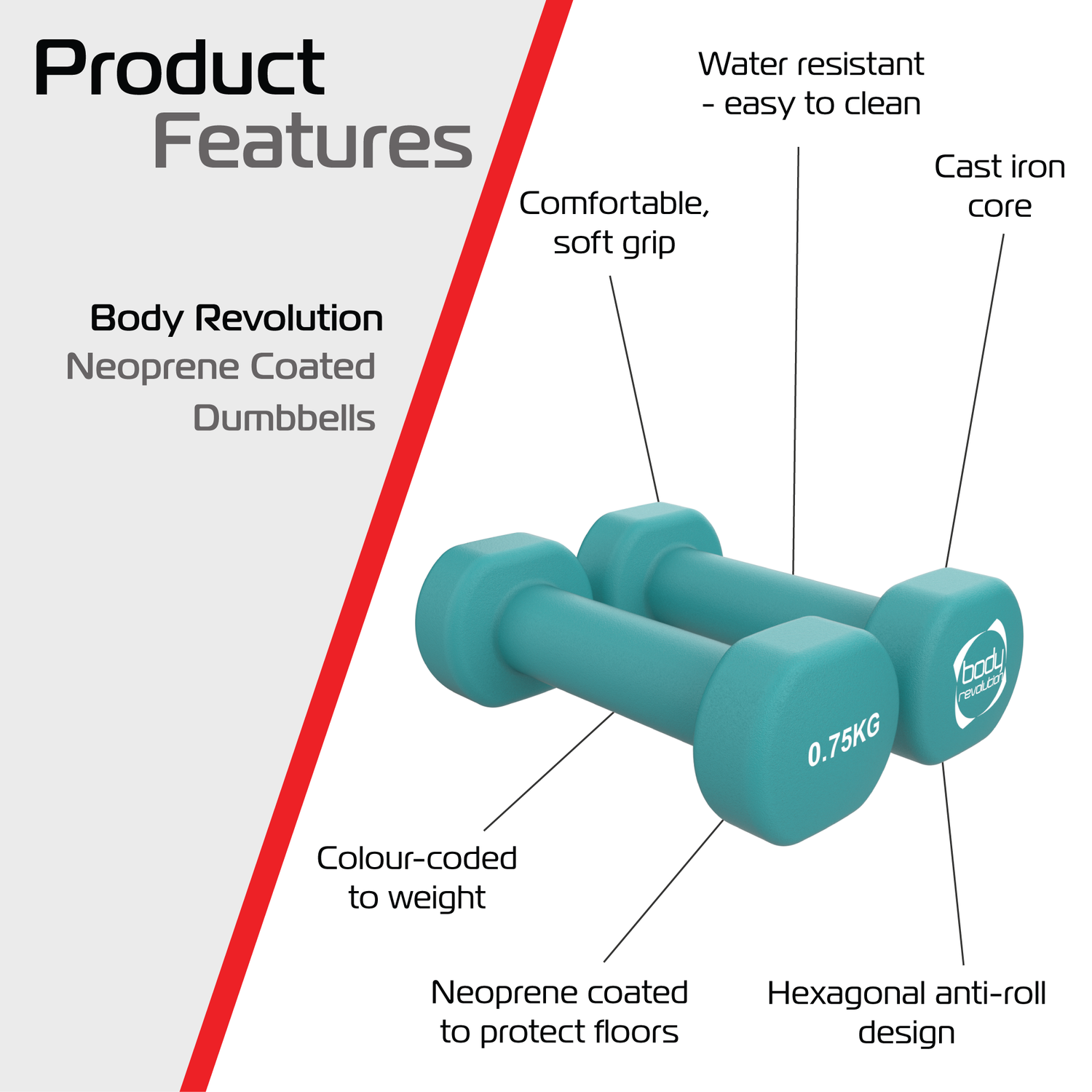 Adecuadas para usar en casa, al aire libre o en el gimnasio, estas mancuernas de neopreno combinan practicidad, durabilidad y rendimiento. Reflejan la misión de Body Revolution de hacer accesible equipo de fuerza de alta calidad a todos. Compactas, fiables y fáciles de usar, son indispensables para fortalecer tu entrenamiento con resistencia ligera.