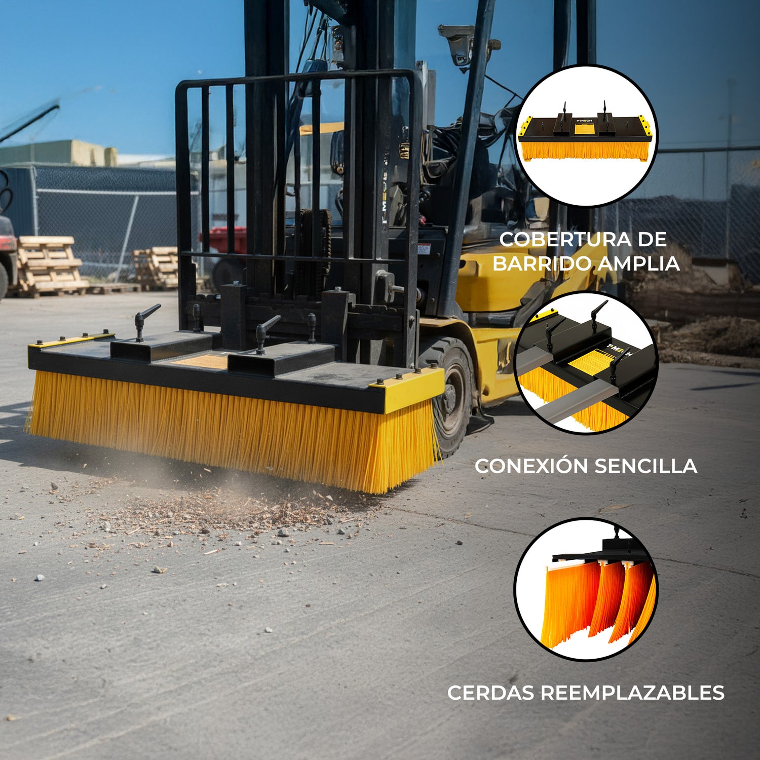 Pensado exclusivamente para superficies interiores lisas, este accesorio convierte tu carretilla montacargas en una potente herramienta de barrido, perfecta para eliminar polvo, residuos de embalaje y la suciedad general del almacén con facilidad y uniformidad.