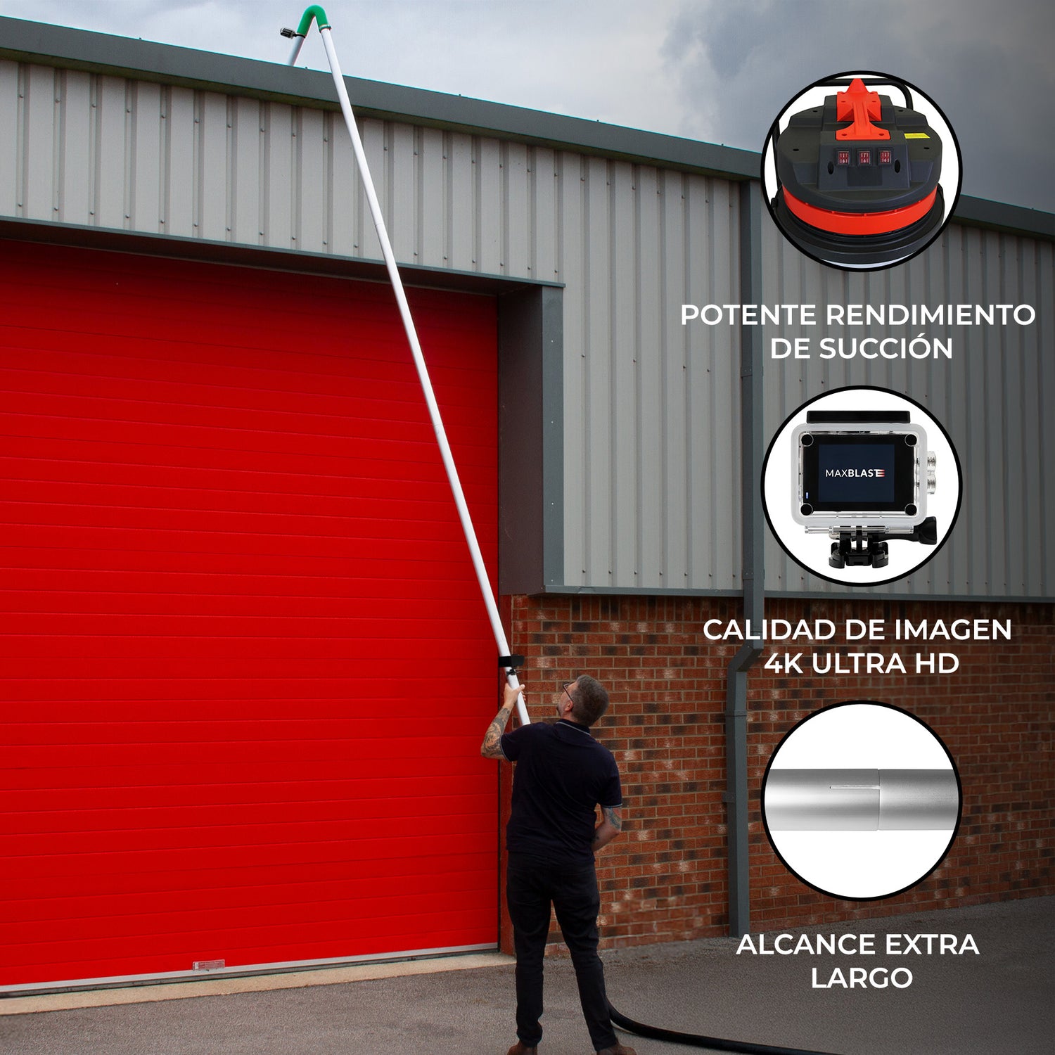 El sistema se completa con una cámara innovadora para aspiradora de canalones, diseñada para transformar tu forma de trabajar, proporcionando imagen en vivo y nítida directamente en tu teléfono. Se coloca en la parte superior del sistema de tubos, capturando cada detalle en resolución 4K a 30 fps, con campo de visión ultra amplio de 170° y zoom 4x, asegurando que ningún bloqueo pase desapercibido.