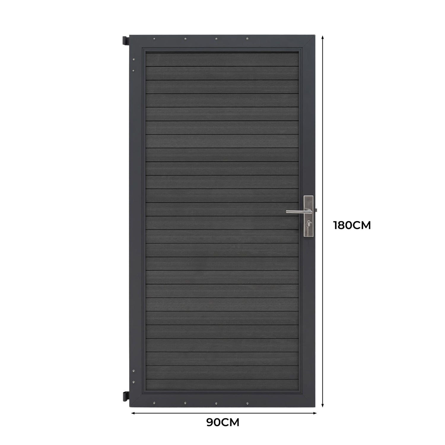 Visualmente, la puerta presenta un acabado de doble cara para adaptarse a tus preferencias de diseño. Un lado muestra una textura de vetas de madera de aspecto natural, mientras que el reverso presenta un acabado ranurado —ambos en un gris neutro y elegante que armoniza con cualquier entorno exterior. Con unas dimensiones de 180 cm de altura y 90 cm de ancho, crea un límite impresionante que protege la privacidad a la vez que realza el estilo de tu espacio exterior.