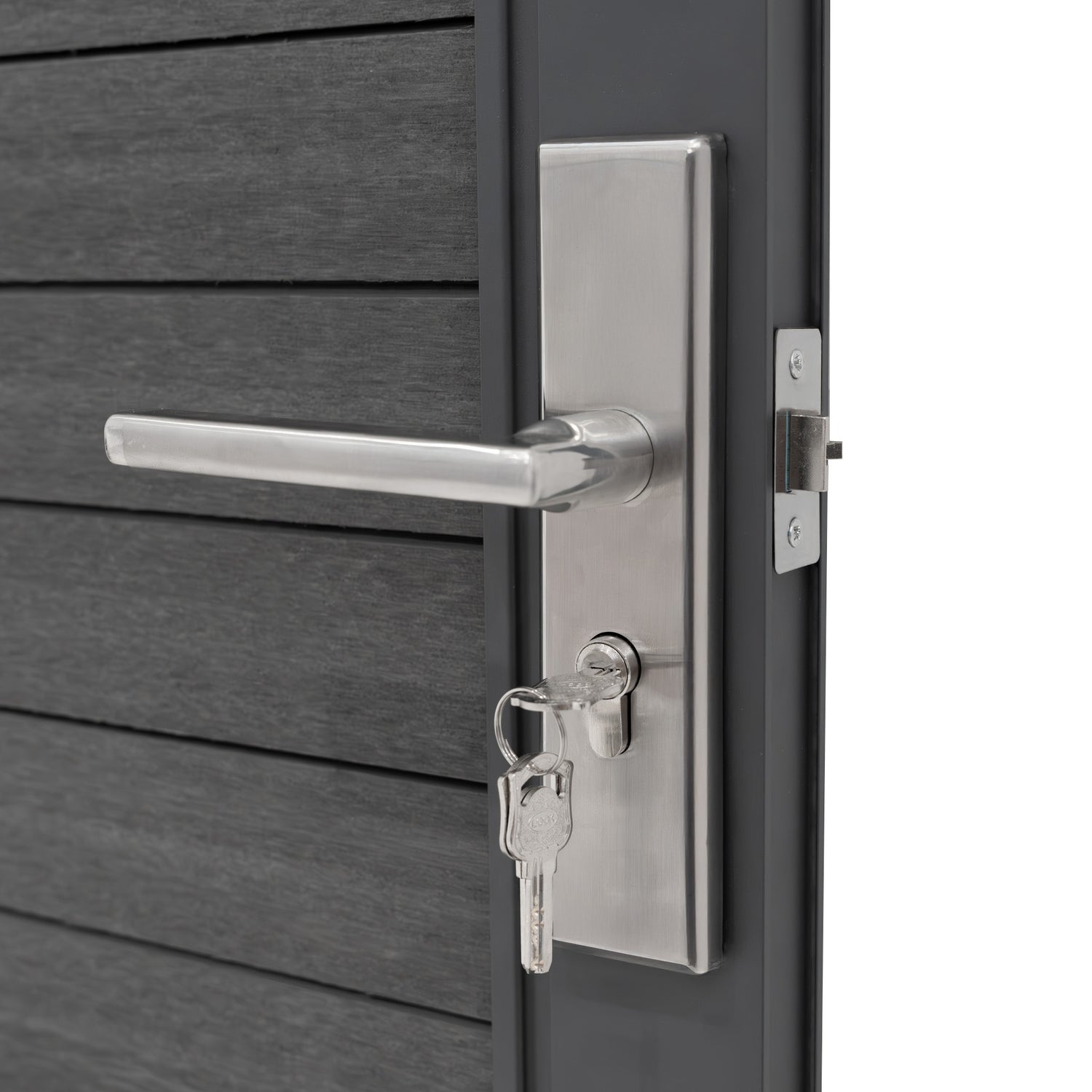 Un aspecto clave de esta puerta es su sistema integrado de manilla y cerradura, diseñado para facilitar su uso y ofrecer tranquilidad. La manilla tiene un diseño ergonómico y elegante que complementa la estética moderna de la puerta, proporcionando un agarre cómodo. La cerradura integrada ofrece seguridad confiable y se suministra con tres llaves, brindando acceso conveniente y la flexibilidad de compartirlo con familiares o visitantes de confianza. Este sistema de cerradura es ideal para quienes buscan mejorar la seguridad de su propiedad sin renunciar al estilo.