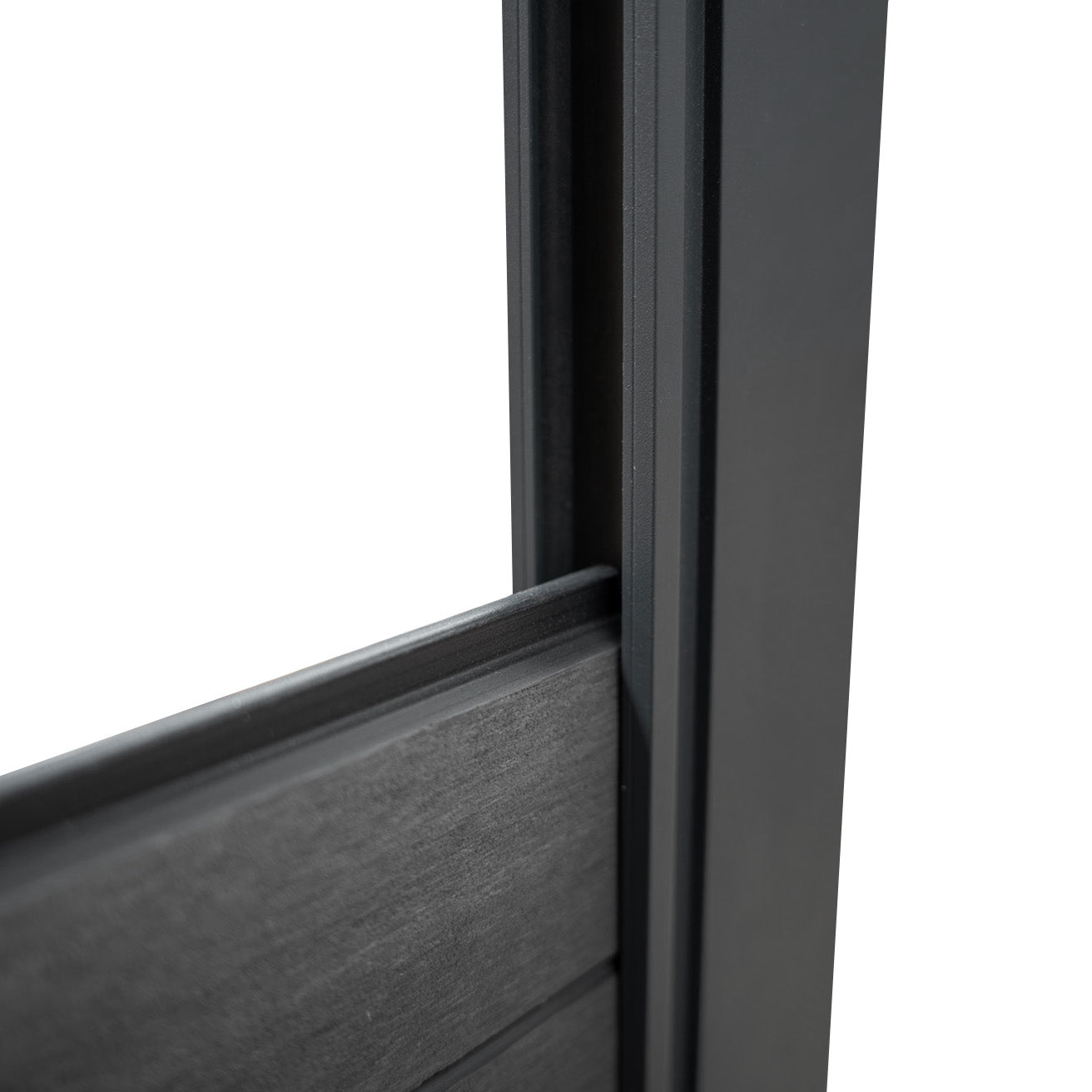 El panel presenta un acabado de doble cara que permite elegir entre una textura de madera natural o un moderno diseño de listones. Ambos lados lucen un elegante tono gris, aportando versatilidad estética y un estilo atemporal que se adapta a cualquier espacio exterior.