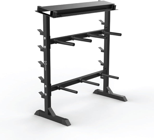 Fabricado con acero duradero, soporta hasta 400 kg y ofrece secciones específicas para mancuernas, barras y discos de peso grandes y pequeños. Su diseño estratégico permite almacenar todo el equipo de fuerza en un solo lugar compacto, mejorando la fluidez del entrenamiento y reduciendo el desorden.